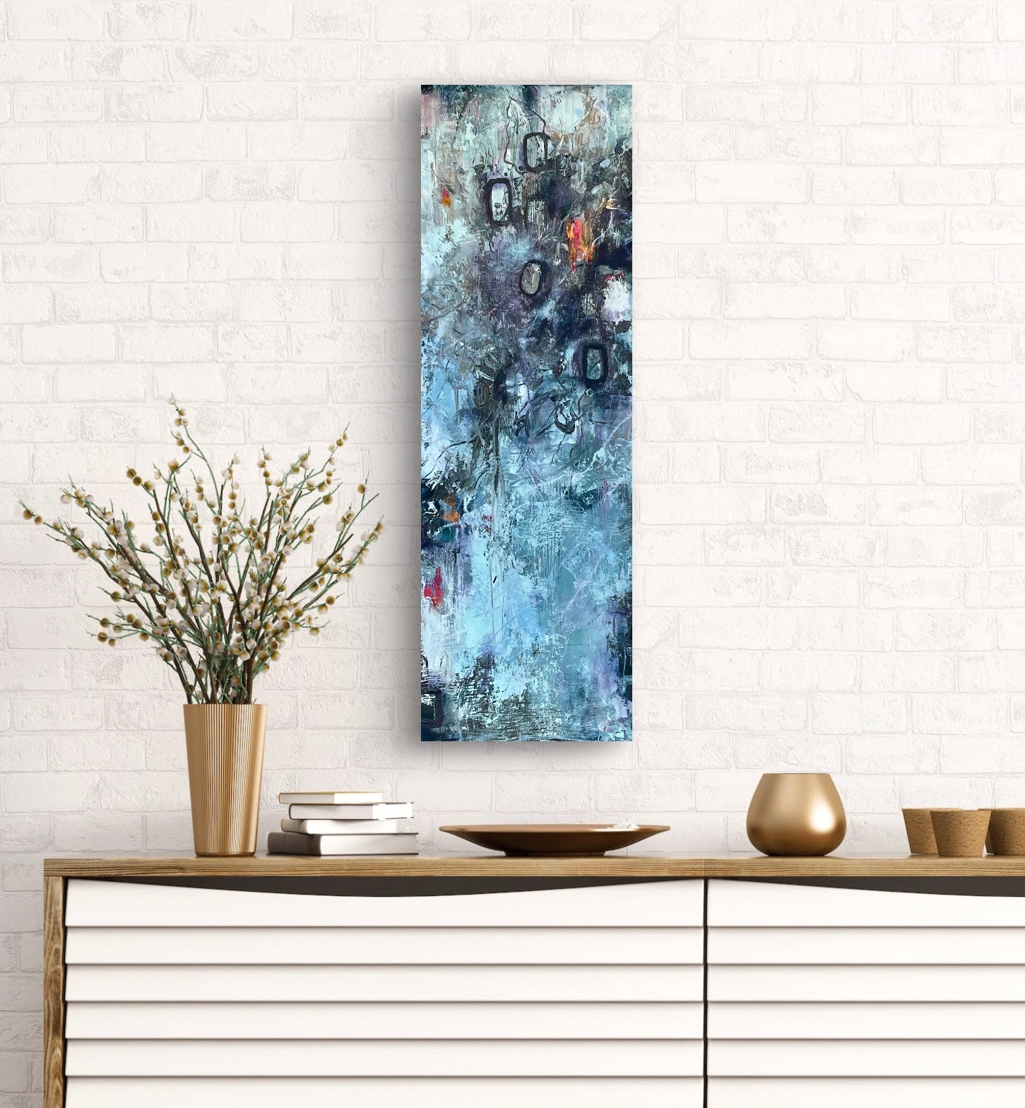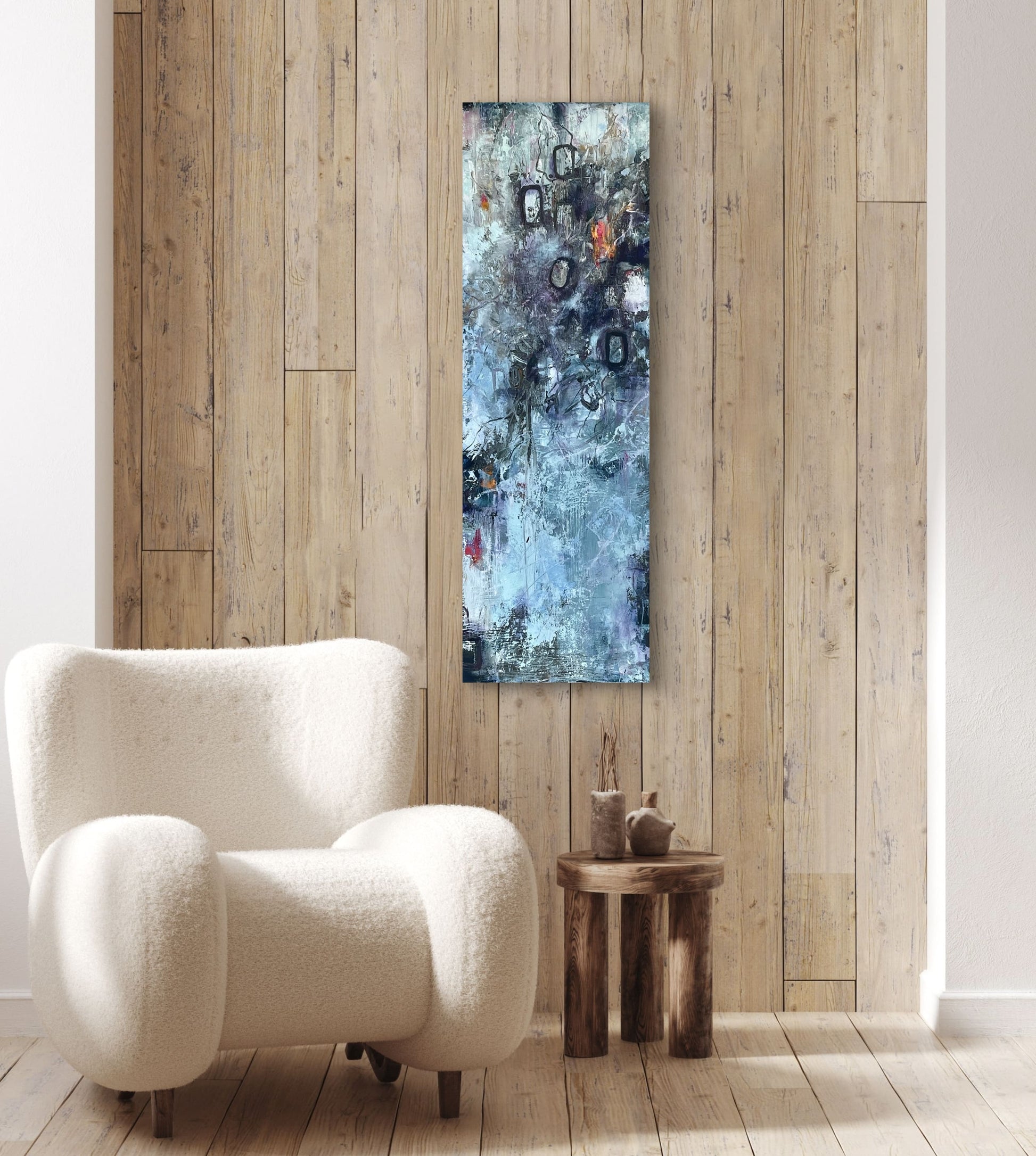 This original abstract is dominated by blue and gray tones with touches of warmer colors. Textured layers and color harmonies create an immersive experience with both organic and geometric forms. A thoughtful balance between control and freedom.