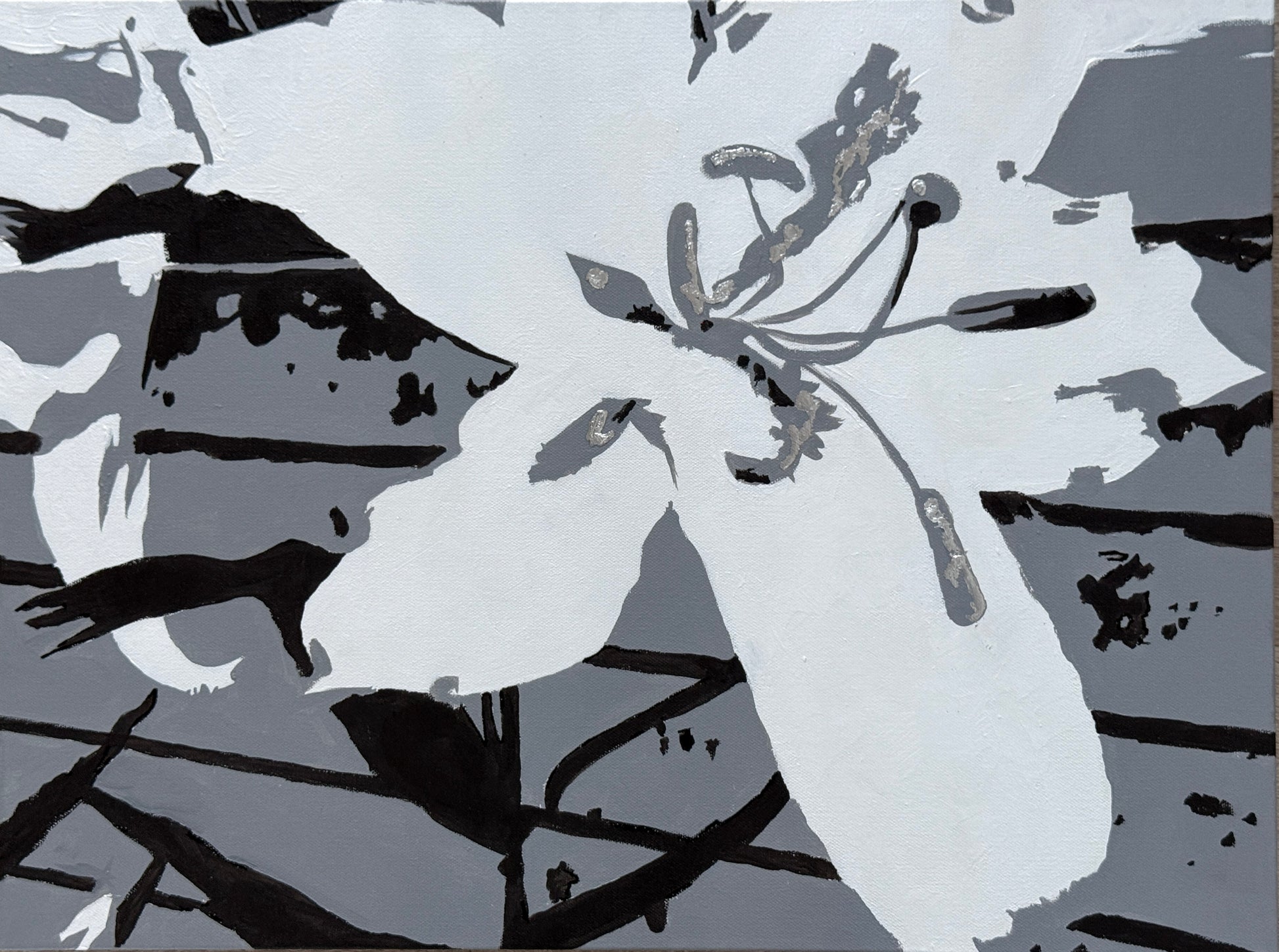 The grayscale palette of this painting invites the viewer to focus on the composition and intricate play of light and shadow. The elegance of the flower takes center stage without the distraction of color. Silver leaf highlights the delicate features of the open blossom. The piece is signed on the bottom edge. Screen colors can vary among computers, so please know that there may be a slight variation in real life.