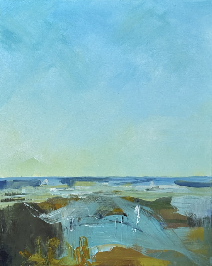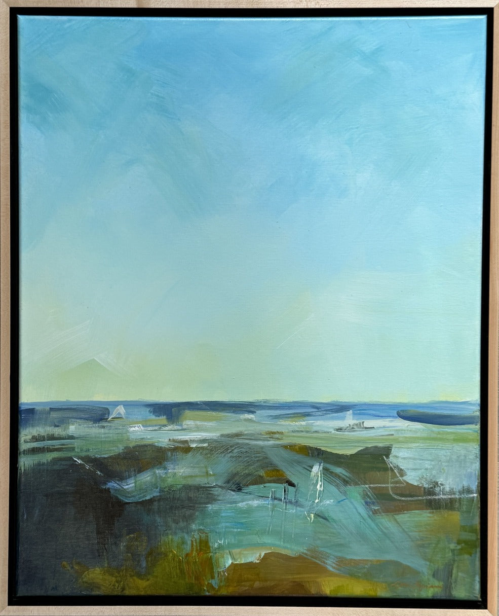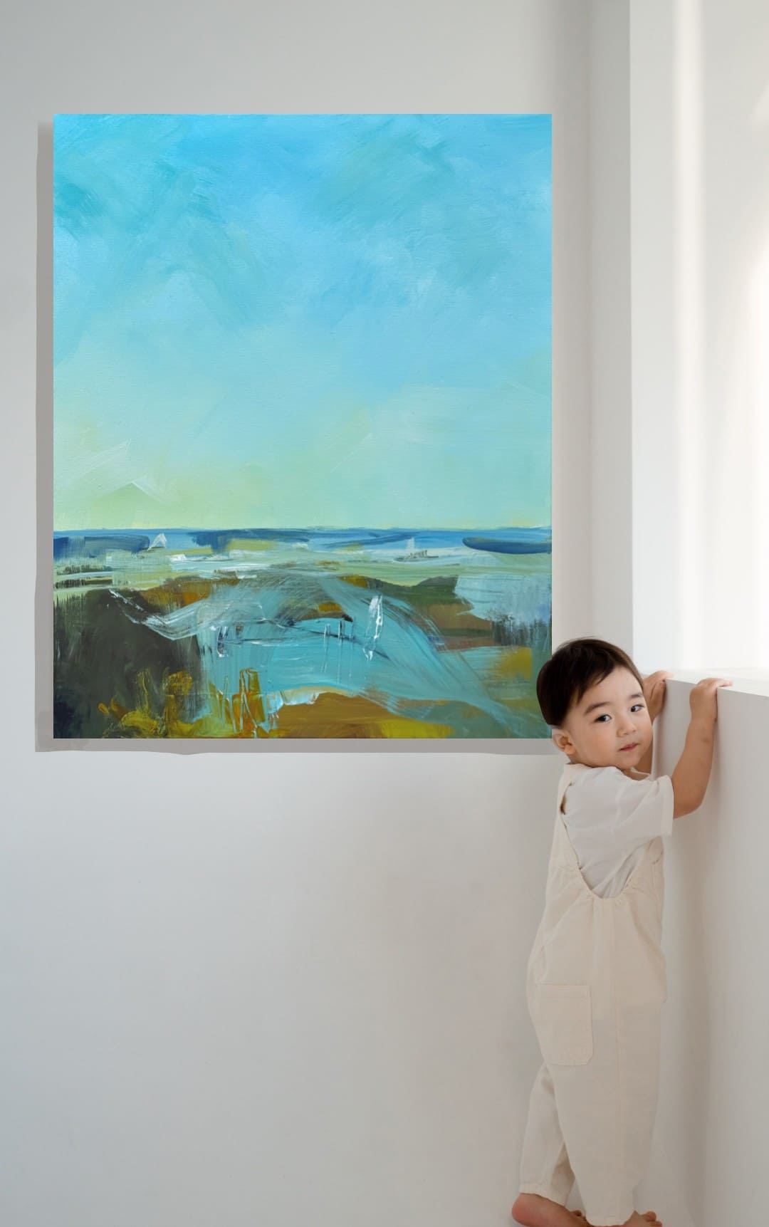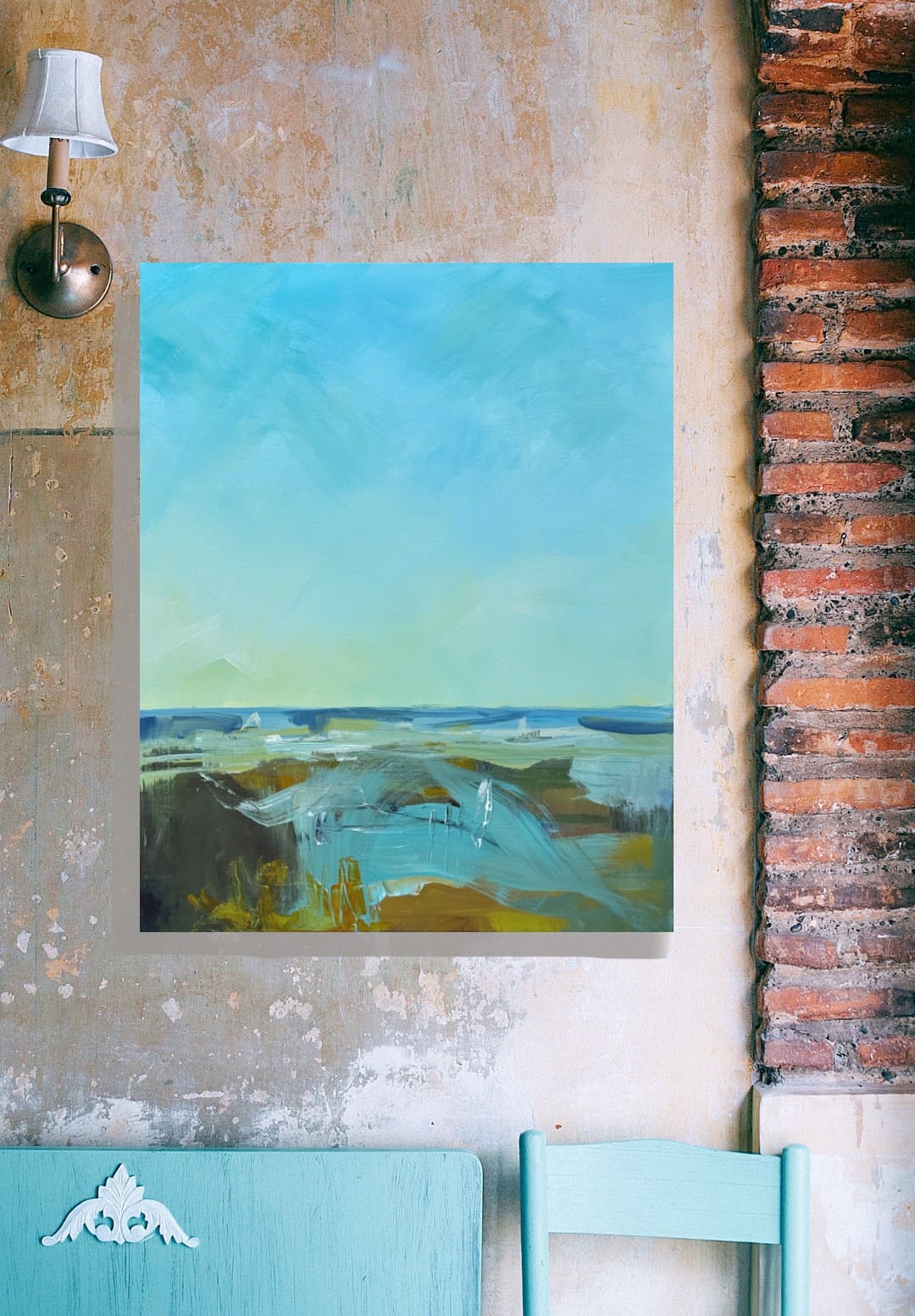 With its soothing palette of ocean blues, seafoam greens, and warm earth tones, this abstract painting captures the essence of a serene coastal landscape. Expressive brushwork and layered textures invite the viewer to feel the calm energy of the shoreline, where sky and water meet in harmonious balance. This contemporary piece brings a sense of tranquility and openness to any space, making it a perfect addition to modern interiors inspired by nature and light.