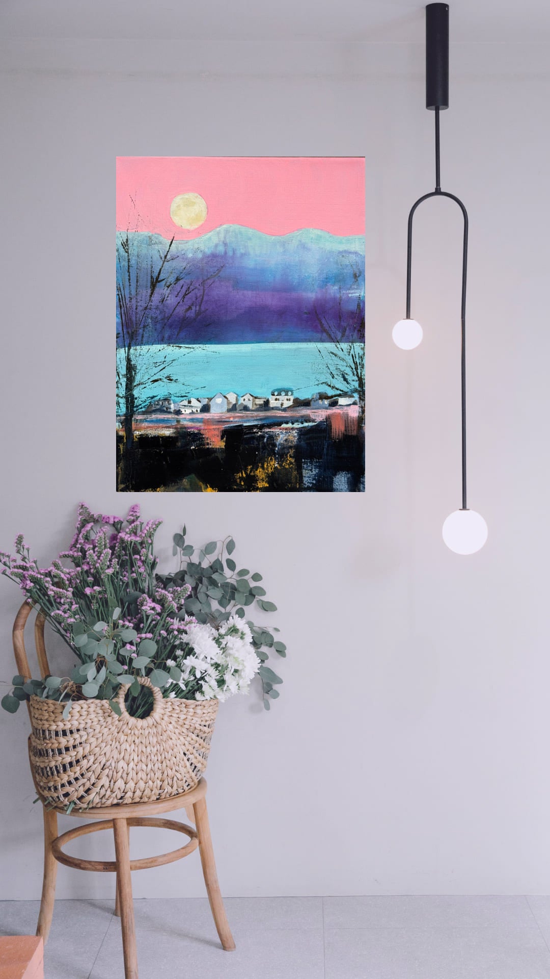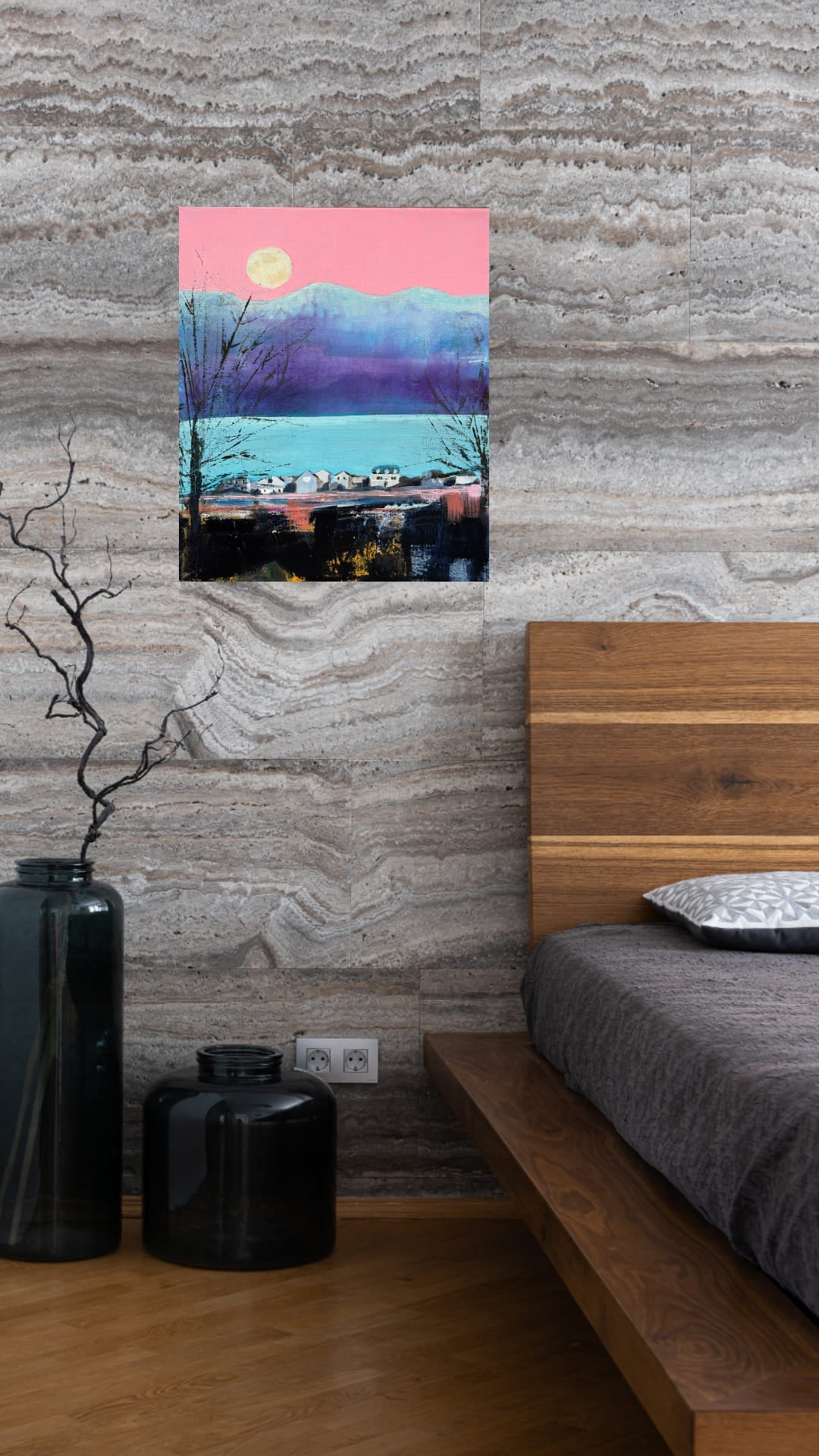16" x 12" x 1.5" acrylic painting on canvas. Wired and ready to hang. UNFRAMED. Any images showing mats or frames are for illustrative purposes only.