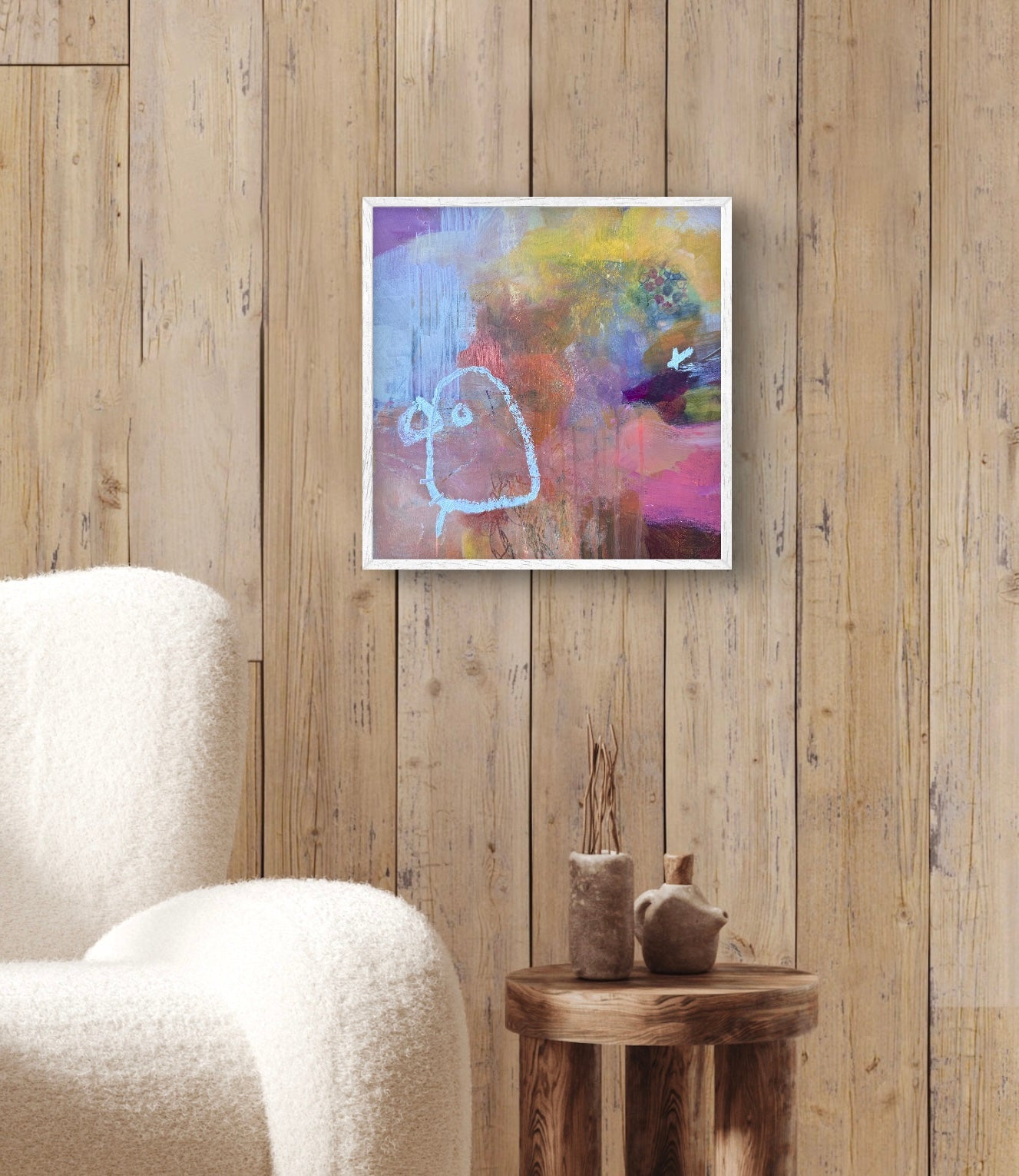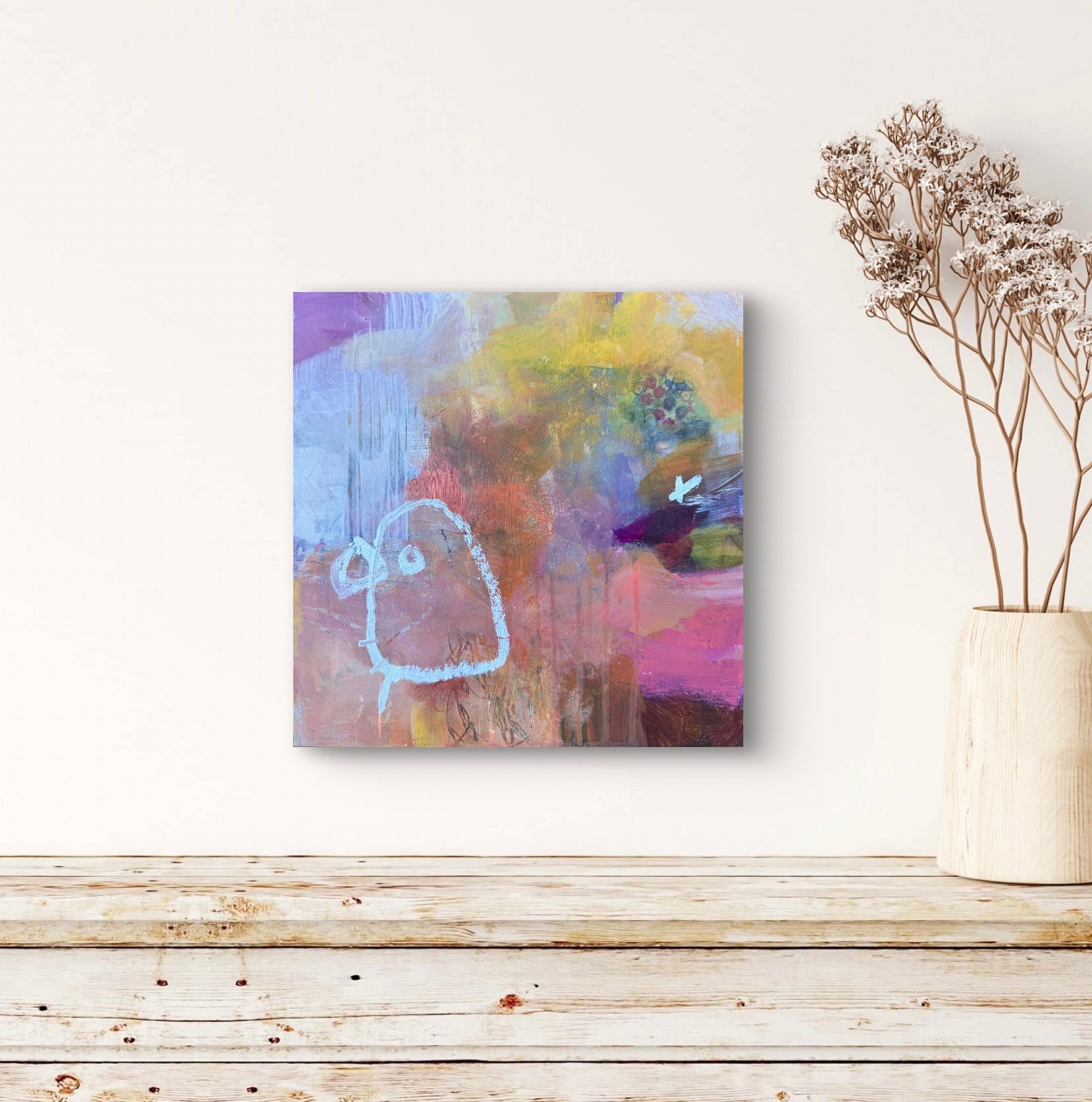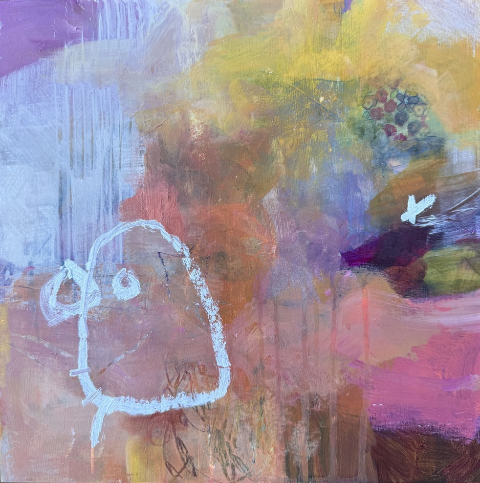12' x 12' mixed media painting on a wood panel. Wired and ready to hang. UNFRAMED. Any images showing mats or frames are for illustrative purposes only.