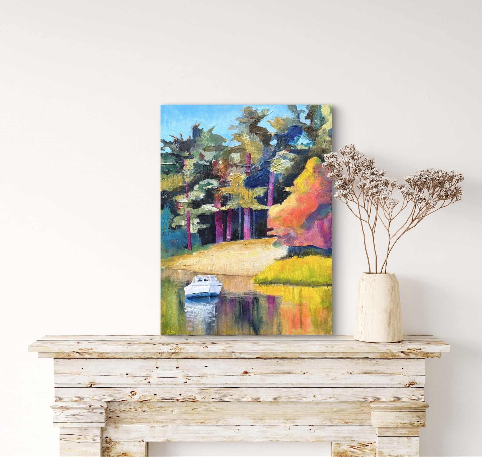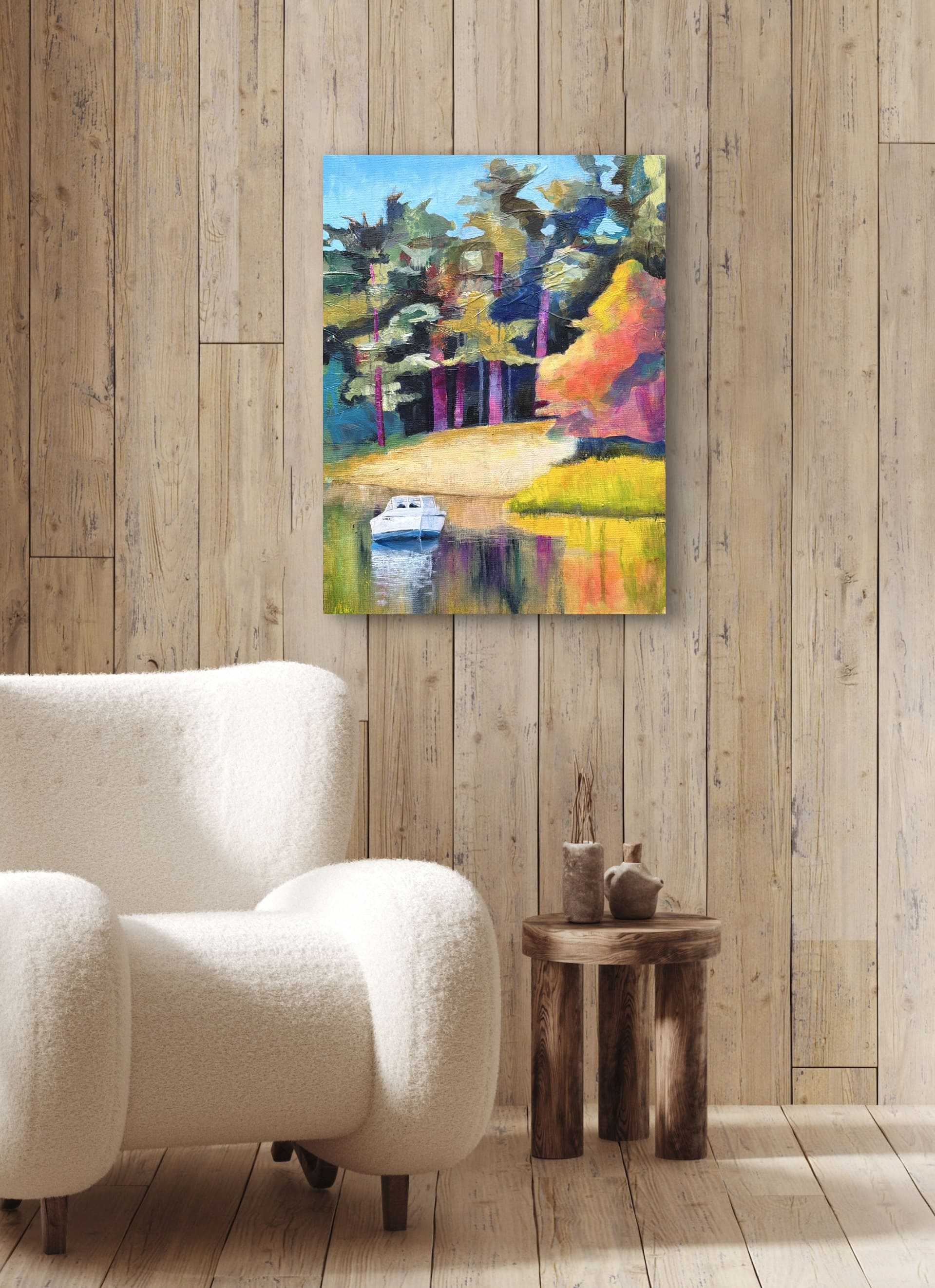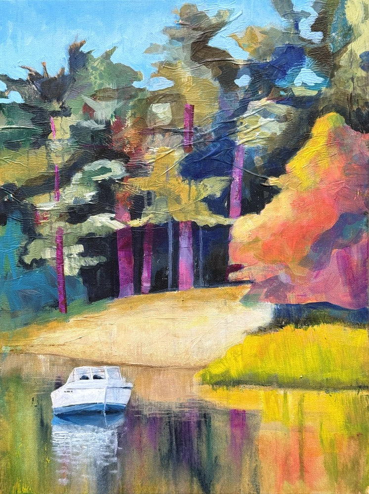 A vivid and expressive landscape painting of a serene river view. Loose and dynamic brushwork lends texture and movement to the scene.