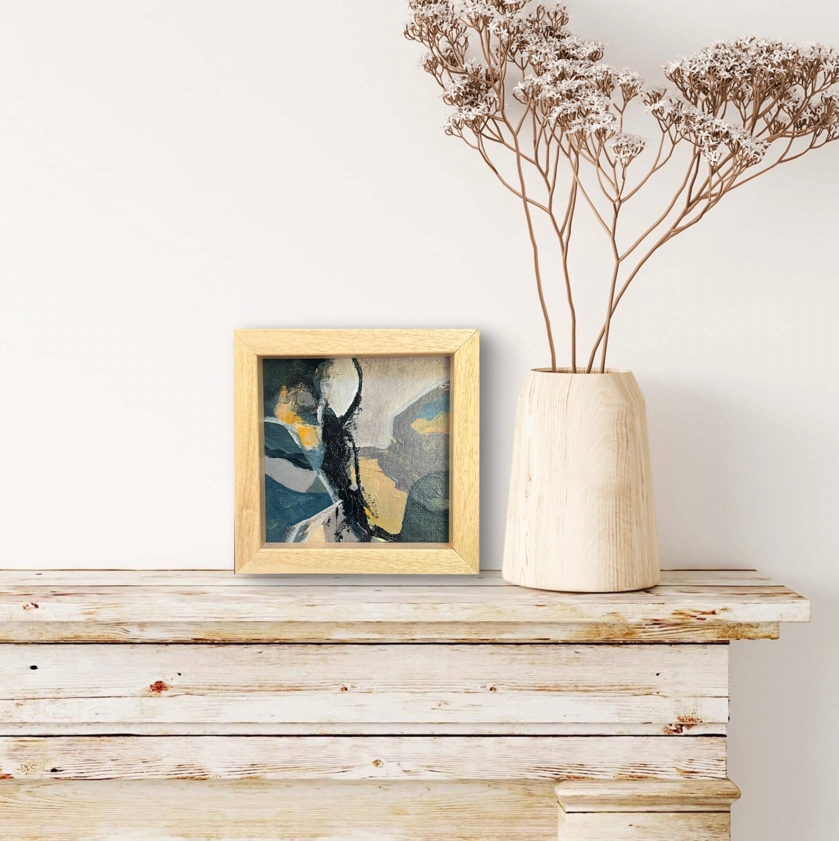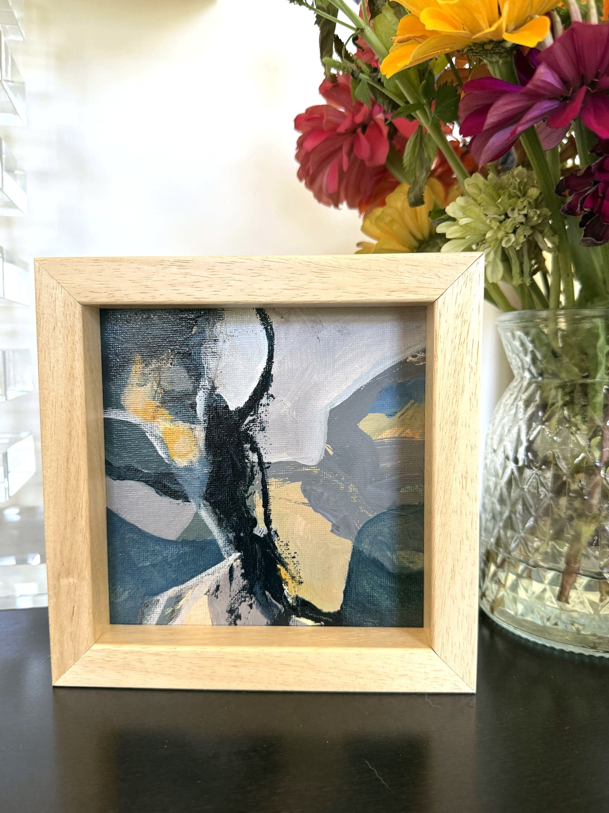 6" x 6" acrylic on canvas panel in a beautiful wood frame as shown. Framed size is 7" x 7" x 1.25". Wide enough to sit on a flat surface or use the sawtooth hanger on back to hang on a wall.