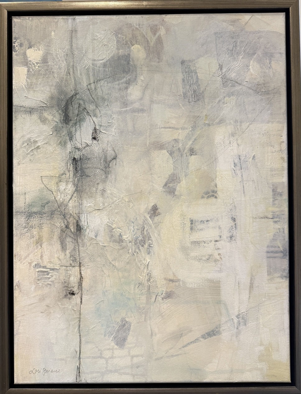 This abstract artwork incorporates subtle brushstrokes and layered elements in soft, muted tones of primarily white, off-white, and pale grays and neutrals. Although it may not show in the photos posted here, the piece is now signed on the front.