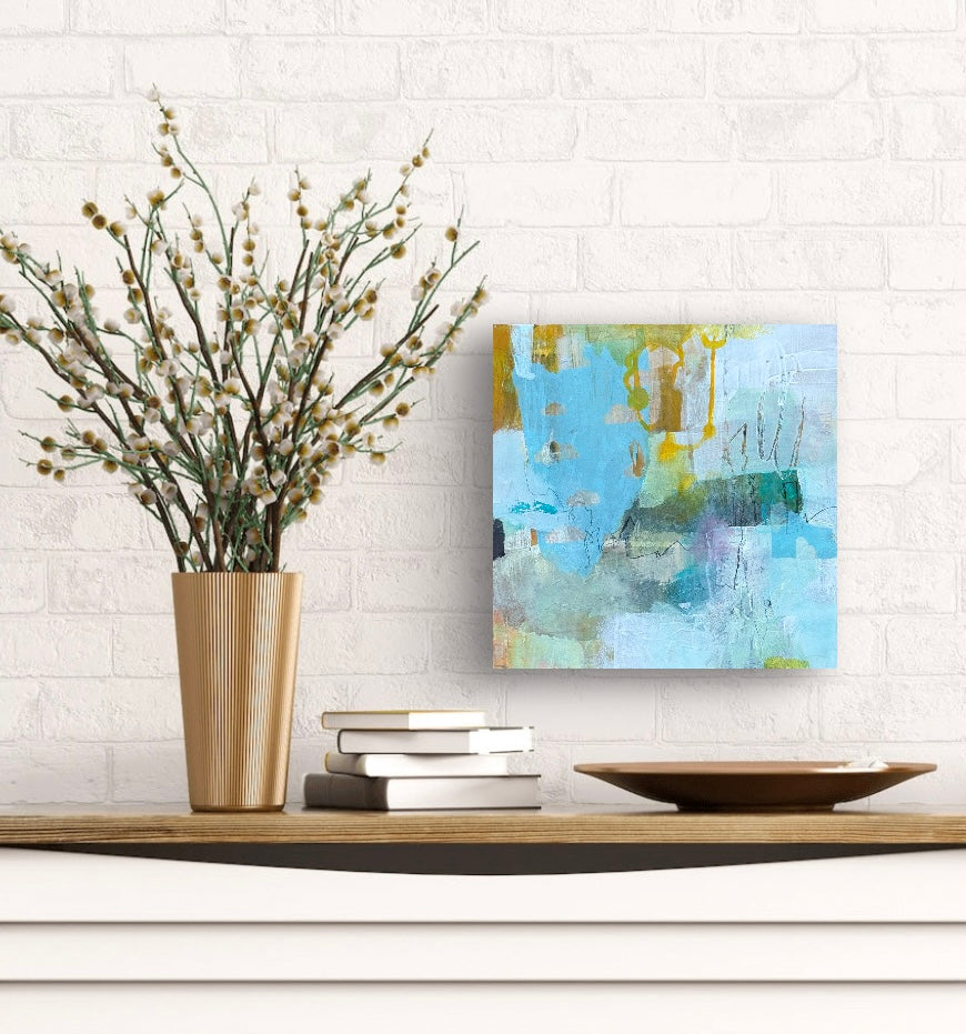 12' x 12' mixed media painting on a wood panel. Wired and ready to hang. UNFRAMED. Any images showing mats or frames are for illustrative purposes only.