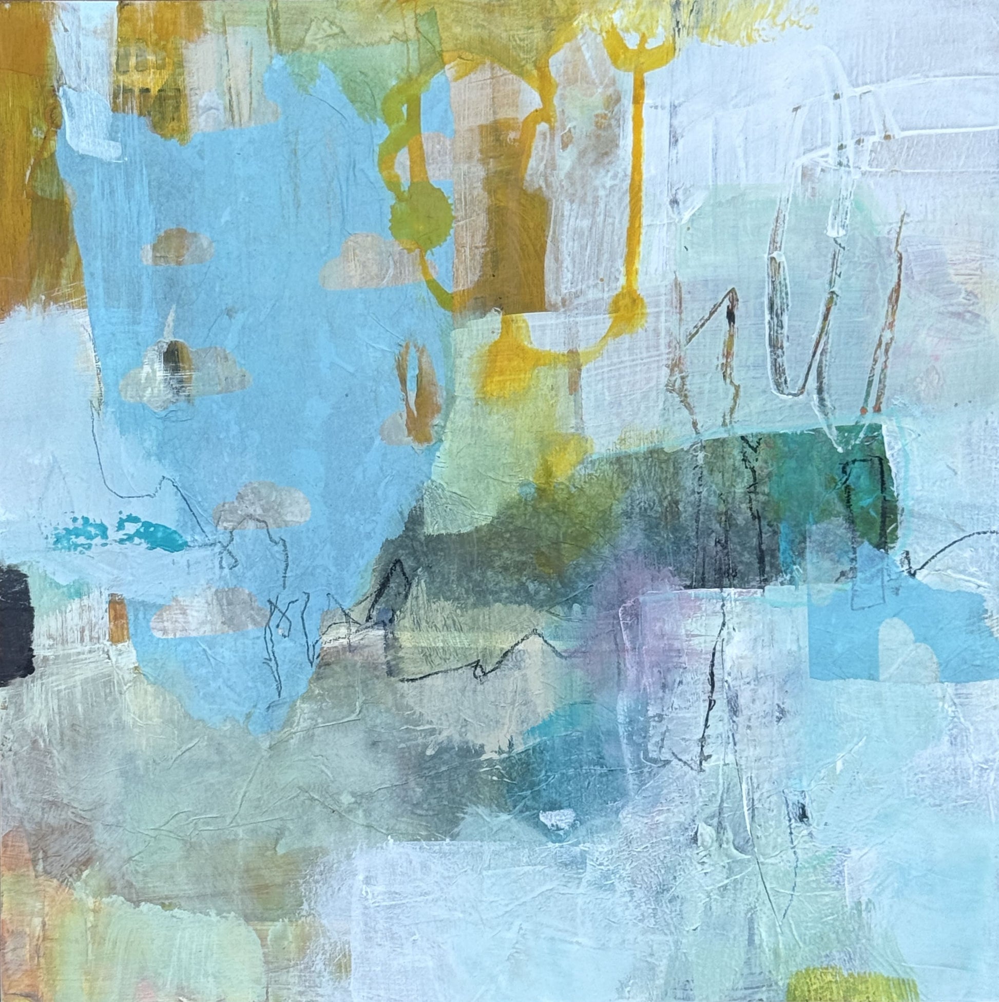 This piece has a vibrant composition of abstract shapes and layers with a dominant palette of blues, greens, yellow, and hints of ochre and white. Scattered pencil-like markings and irregular lines add an element of spontaneity and texture.