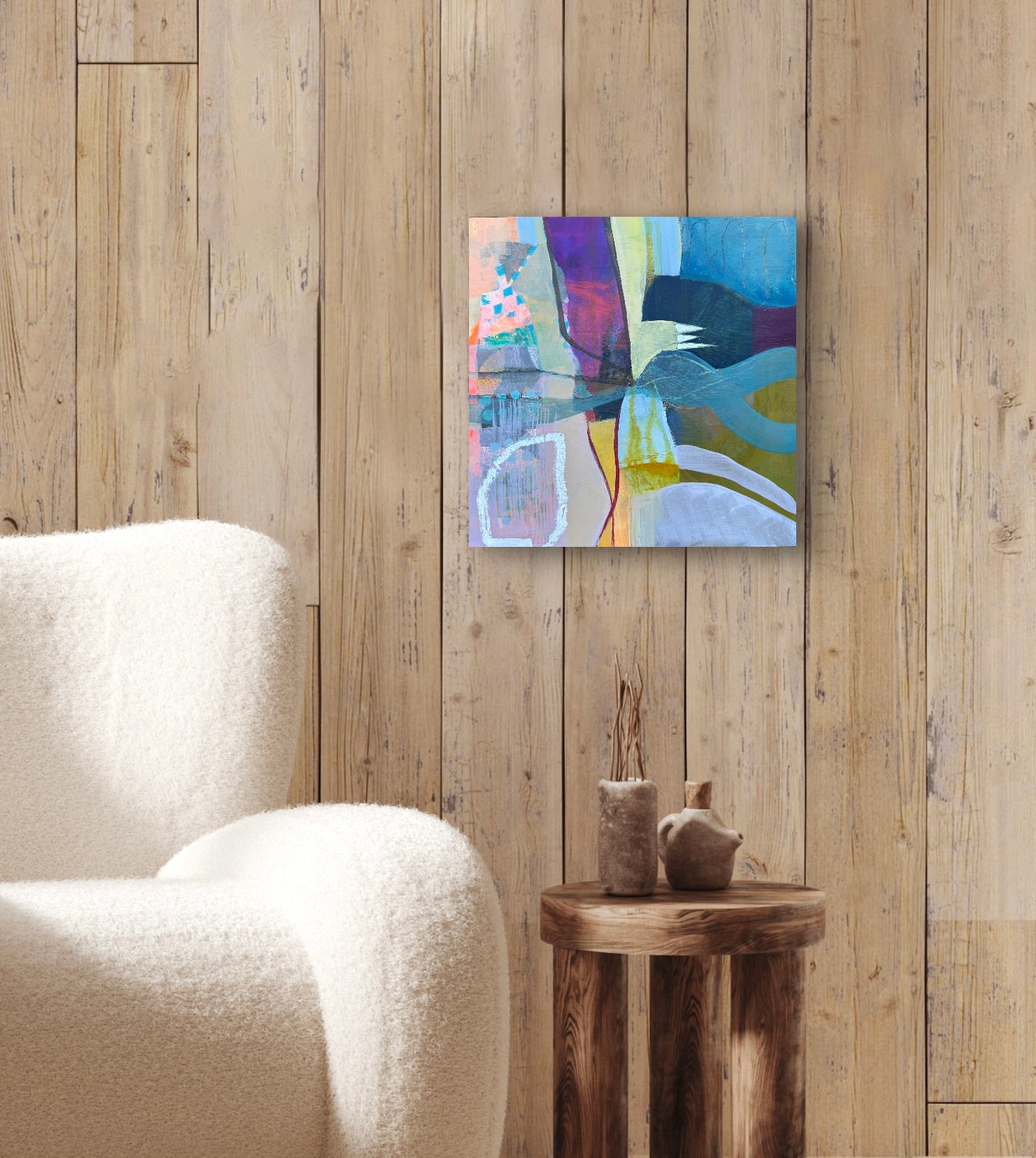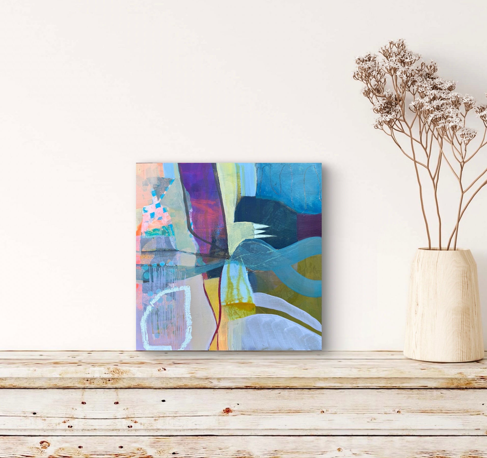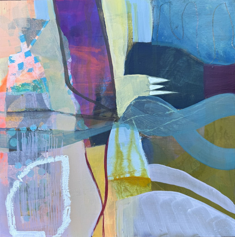 12' x 12' mixed media painting on a wood panel. Wired and ready to hang. UNFRAMED. Any images showing mats or frames are for illustrative purposes only.